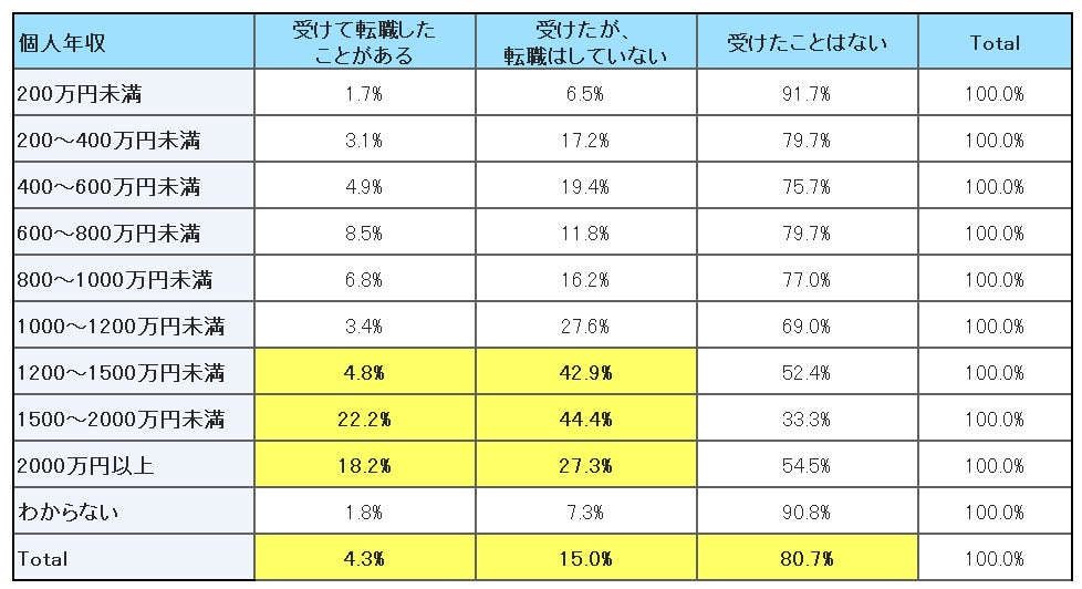 個人年収別で見ると、年収1,200万円以上になると約5割がスカウトを受けた経験があると答えており、年収の上昇に応じて、スカウト経験の割合が上がることが分かりました。
